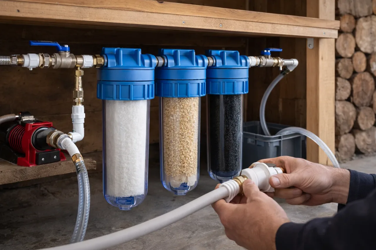 Для дачи чаще нужен не идеальный питьевой результат, а понятная рабочая схема, которая убирает мутность, ржавчину и песок. В этом случае обычно хватает двух ступеней: сетка на входе и угольный или засыпной блок на кухню либо душ.