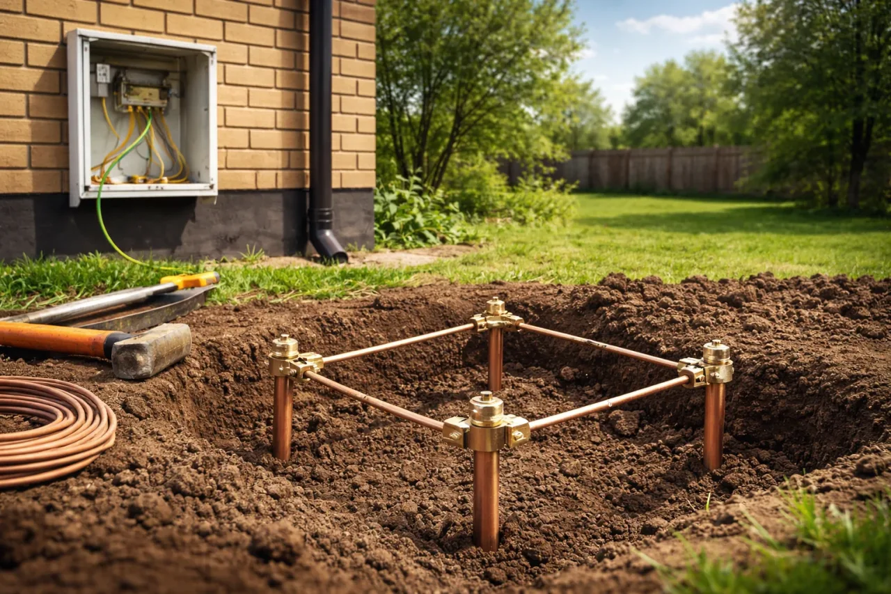 Глубина зависит от типа грунта и уровня его влажности. Важно, чтобы электроды проходили верхний сухой слой и работали в более стабильном грунте. Именно поэтому глубина заземления в частном доме подбирается не по одной универсальной цифре, а с учетом почвы и конструкции контура.